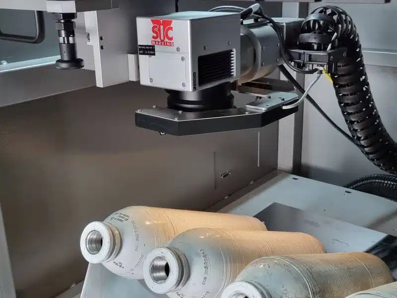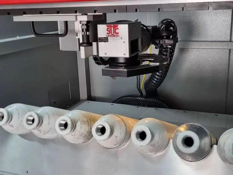 Gasflaschen müssen alle 10 Jahre einer wiederkehrenden Prüfung unterzogen werden. Nach erfolgreichem Abschluss der Prüfung muss die Flasche mit verschiedenen Informationen, einschließlich des Datums der nächsten Prüfung, neu gekennzeichnet werden. Unsere Laserkennzeichnungssysteme eignen sich hervorragend zum Markieren einer Vielzahl von Flaschen unterschiedlicher Größe.